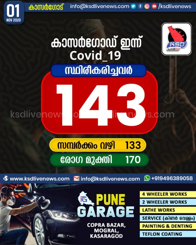 കാസര്കോട് ജില്ലയില് 143 പേര്ക്ക് കോവിഡ്, 170 പേര്ക്ക് രോഗമുക്തി