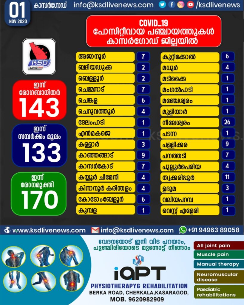 കാസർഗോഡ് ജില്ലയിൽ ഇന്ന് കോവിഡ് പോസിറ്റീവായവരുടെ പഞ്ചായത്ത് തിരിച്ചുള്ള സ്ഥിതി വിവര കണക്ക്