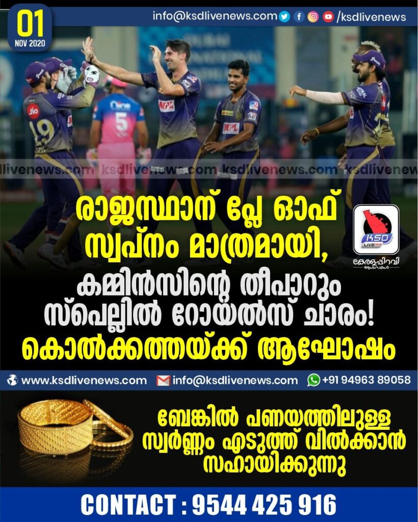 രാജസ്ഥാന് പ്ലേ ഓഫ് സ്വപ്നം മാത്രമായി , കമ്മിന്സിന്റെ തീപാറും സ്പെല്ലില് റോയല്സ് ചാരം ! കൊൽക്കത്തയ്ക്ക് ആഘോഷം