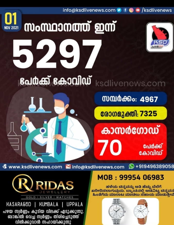 ആശ്വാസം ; കേരളത്തിൽ കോവിഡ് കുറയുന്നു; സംസ്ഥാനത്ത് ഇന്ന് 5297 പേർക്ക് കോവിഡ് സ്ഥിരീകരിച്ചു. സമ്പർക്കം വഴി 4967 പേർക്കും ; ആശ്വാസമായി 7325 പേർക്ക് രോഗ മുക്തിയും ; കാസർഗോഡ് ജില്ലയിൽ 70 പേർക്ക് പുതിയ കോവിഡ് കേസുകൾ ; മരണം 78