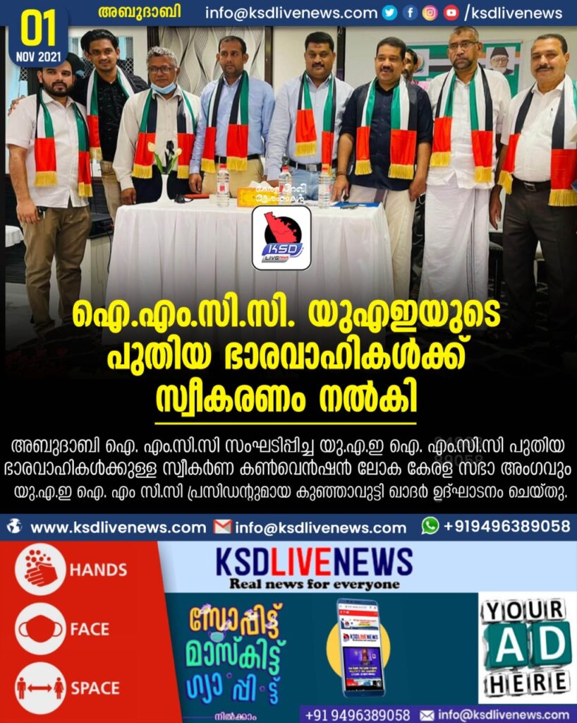 അബുദാബി ഐ. എം.സി.സി പ്രസിഡന്റ് എൻ.എം അബ്ദുള്ളയുടെ അധ്യക്ഷതയിൽ ചേർന്ന കൺവെൻഷൻ യു. എ. ഇ ഐ. എം.സി.സി ജനറൽ സെക്രട്ടറി പി.എം ഫാറൂഖ് മുഖ്യപ്രഭാഷണം നടത്തി,അനീസ് റഹ്മാൻ നിർവേലി,താഹിറലി പൊറോപ്പാട്,പി.പി ബഷീർ,അഷ്റഫ് തച്ചറോത്,എം.റിയാസ്, ഷറഫുദ്ദീൻ പെരിങ്ങത്തൂർ, റഷീദ് പാനൂർ,കുഞ്ഞാപ്പു മലപ്പുറം, ഹമീദ് എരോൾ യൂനിസ് അതിഞ്ഞാൽ,മുഹമ്മദ് കുഞ്ഞി കൊത്തിക്കാൽ എന്നിവർ ആശംസാ പ്രസംഗം നടത്തി.