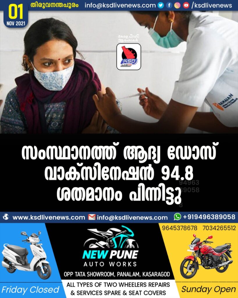 സംസ്ഥാനത്ത് ആദ്യ ഡോസ് വാക്സിനേഷന് 94.8 ശതമാനം പിന്നിട്ടു