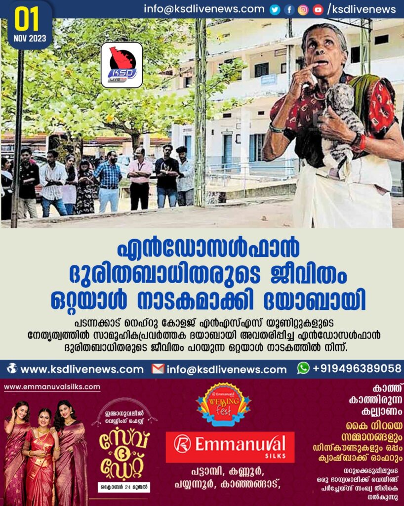 നീലേശ്വരം ∙ എൻഡോസൾഫാൻ ദുരിതബാധിതരുടെ ജീവിതം ഒറ്റയാൾ നാടകമായി അവതരിപ്പിച്ച് സാമൂഹിക പ്രവർത്തക ദയാബായി. പടന്നക്കാട് നെഹ്റു ആർട്സ് ആൻഡ് സയൻസ് കോളജ് എൻഎസ്എസ് യൂണിറ്റിന്റെ നേതൃത്വത്തിലാണ് നാടകം അരങ്ങേറിയത്. എൻഡോസൾഫാൻ ബാധിതരുടെ പ്രശ്നങ്ങളിലിടപെട്ട് നിരാഹാര സമരം ഉൾപ്പെടെയുള്ളവ നടത്തിയിട്ടും ദുരിതബാധിതരുടെ ആനുകൂല്യം അനുവദിക്കാതിരിക്കുന്ന സാഹചര്യത്തിലാണ് ഏകാംഗ നാടകം എന്ന ആശയത്തിലെത്തിയത്. ചെറിയ സമയം കൊണ്ട് കാണികളുടെ മനസ്സ് പിടിച്ചെടുക്കുന്ന ആവിഷ്കാരമാണ് ഇവർ വേദിയിൽ അവതരിപ്പിച്ചത്. ദുരിതബാധിതരെ സഹായിക്കാനും സംരക്ഷിക്കാനും സമൂഹത്തെ പ്രേരിപ്പിക്കുന്നതാണ് പ്രമേയം. ദുരിതബാധിതർക്കായി ഇനിയും ഒരുപാട് ചെയ്യാനുണ്ടെന്ന ഓർമപ്പെടുത്തലോടെയാണ് നാടകം അവസാനിക്കുന്നത്. നെഹ്റു കോളജ് പ്രിൻസിപ്പൽ ഡോ.കെ.വി.മുരളി പരിപാടി ഉദ്ഘാടനം ചെയ്തു. മലയാള വിഭാഗം അധ്യക്ഷ ഡോ.ധന്യ കീപ്പേരി, അധ്യാപിക ഡോ.കെ.പി.ഷീജ, എൻഎസ്എസ് പ്രോഗ്രാം ഓഫിസർ വി.വിജയകുമാർ, വൊളന്റിയർ സെക്രട്ടറി കെ.വി.അമ്പിളി എന്നിവർ പ്രസംഗിച്ചു.