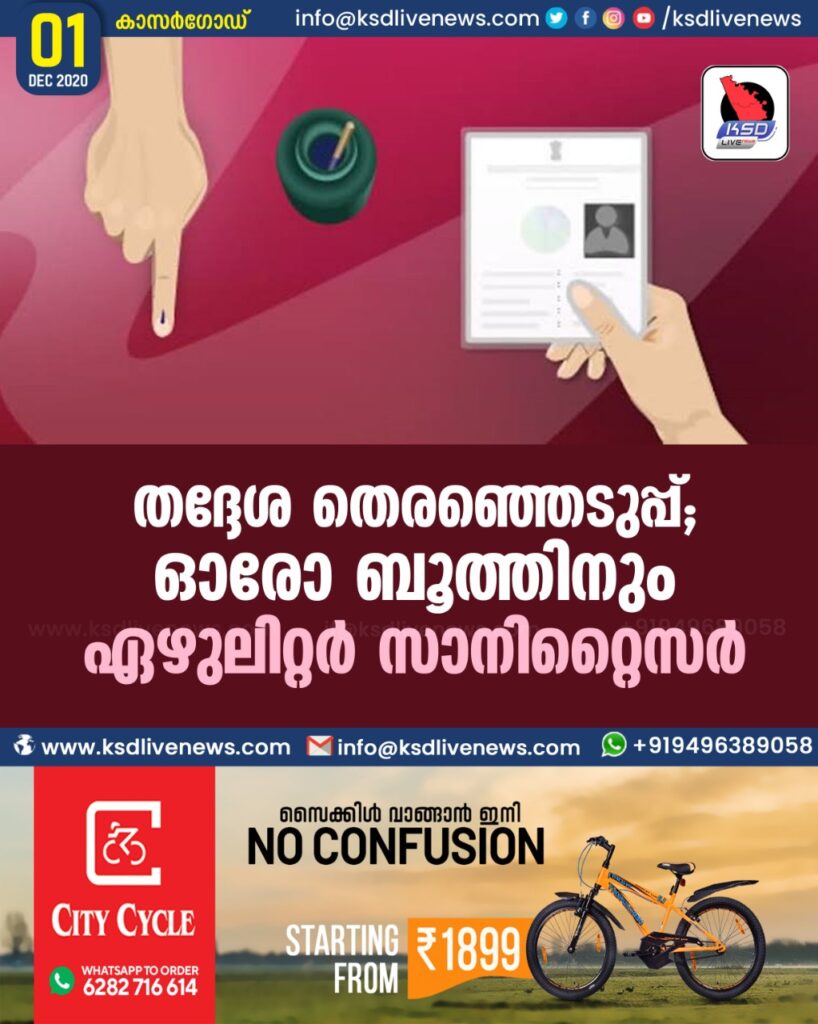 കാസർഗോഡ് : കോവിഡ് ചട്ടങ്ങളുടെ ഭാഗമായി ഓരോ പോളിങ്‌ ബൂത്തിലേക്കും ഏഴുലിറ്റർ സാനിറ്റൈസർ നൽകും. അഞ്ച് ലിറ്ററിന്റെ ഒരു കാൻ, 500 മില്ലിലിറ്ററിന്റെ നാല് കുപ്പികൾ എന്നിവയാണ് നൽകുക. 18 മുഖാവരണം, 12 ജോടി കൈയുറ, ആറ്‌ ഫെയ്‌സ് ഷീൽഡ്, പി.പി.ഇ. കിറ്റ് എന്നിവയും ബൂത്തിലുണ്ടാകും.