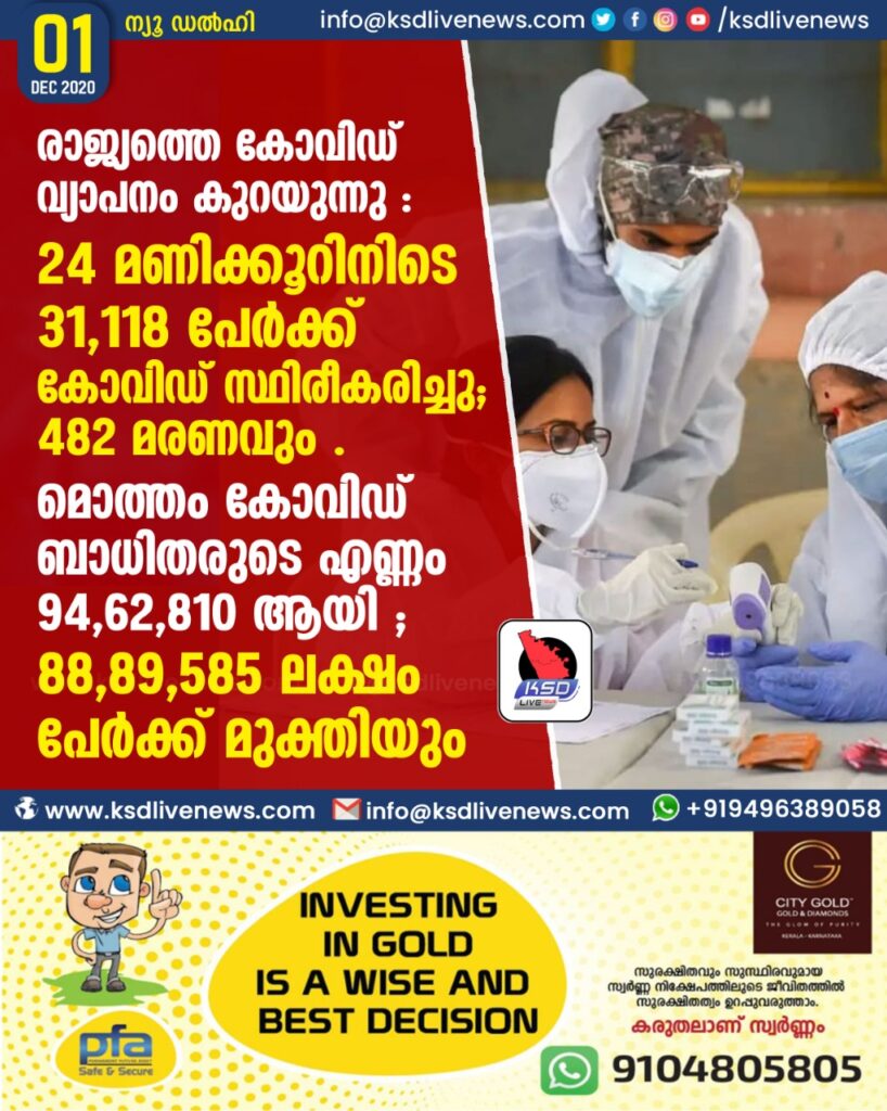 24 മണിക്കൂറിനിടെ 31,118 പേർക്ക് കോവിഡ് സ്ഥിരീകരിച്ചു ; 482