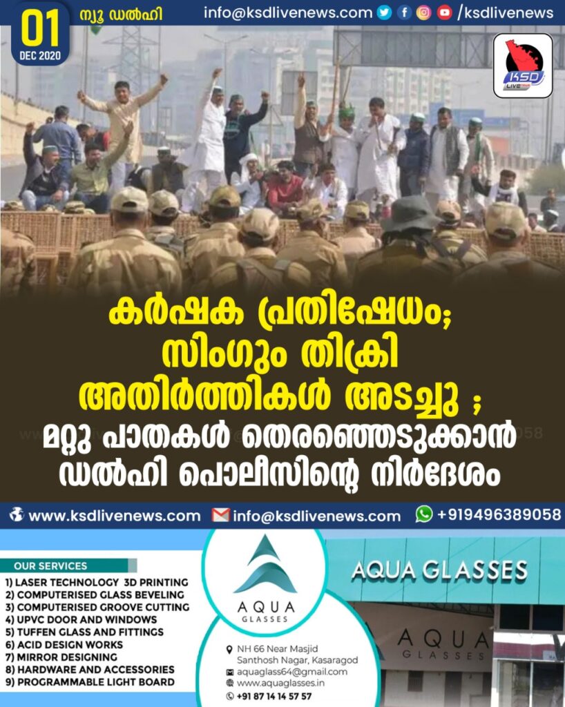 കർഷക പ്രതിഷേധം ; സിംഗും തിക്രി അതിർത്തികൾ അടച്ചു ; മറ്റു പാതകൾ തെരഞ്ഞെടുക്കാൻ ഡൽഹി പൊലീസിന്റെ നിർദേശം