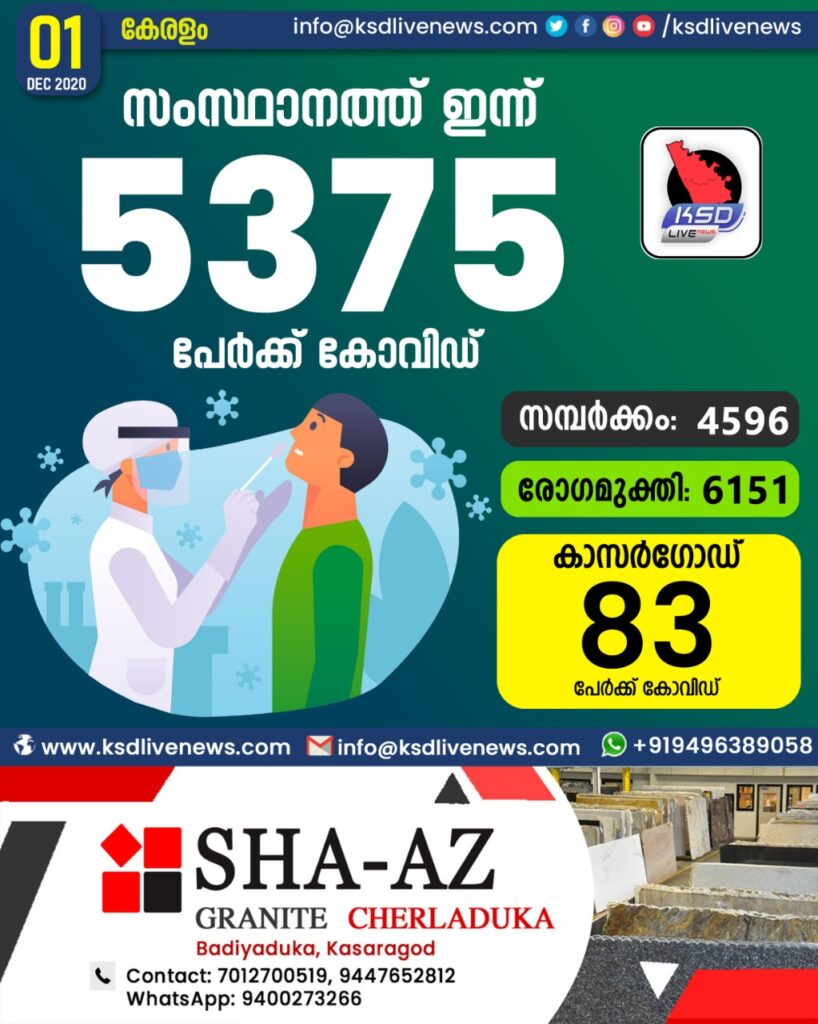 സംസ്ഥാനത്ത് ഇന്ന് 5375 പേർക്ക് കോവിഡ് സ്ഥിരീകരിച്ചു. സമ്പർക്കം വഴി 4596 പേർക്കും ; ആശ്വാസമായി 6151 പേർക്ക് രോഗ മുക്തിയും ; കാസർഗോഡ് ജില്ലയിൽ 83 പേർക്ക് പുതിയ കോവിഡ് കേസുകൾ ; മരണം 26