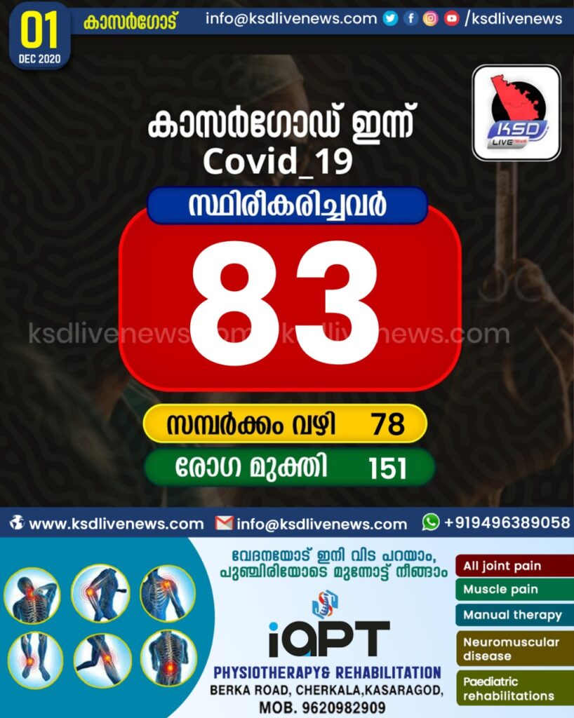 കാസര്കോട് ജില്ലയില് 83 പേര്ക്ക് കോവിഡ്, 151 പേര്ക്ക് രോഗമുക്തി