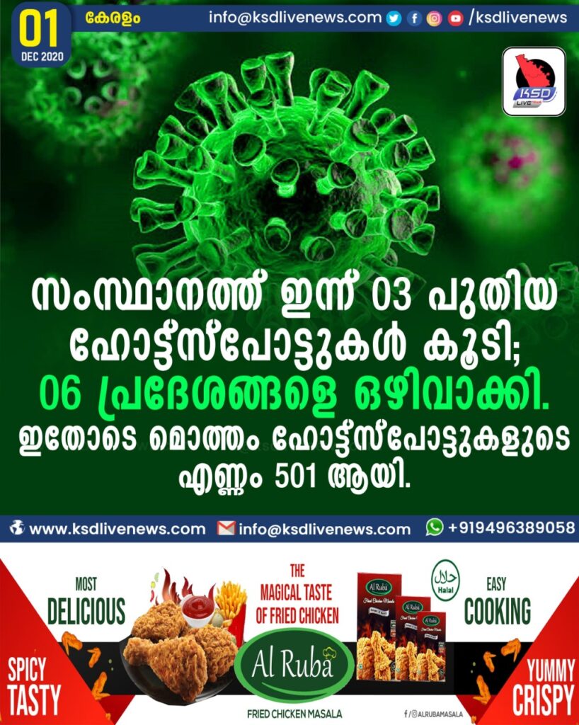 സംസ്ഥാനത്ത് ഇന്ന് 03 പുതിയ ഹോട്ട്സ്പോട്ടുകള്‍ കൂടി; 06 പ്രദേശങ്ങളെ ഒഴിവാക്കി. ഇതോടെ മൊത്തം ഹോട്ട്‌സ്‌പോട്ടുകളുടെ എണ്ണം 501 ആയി.