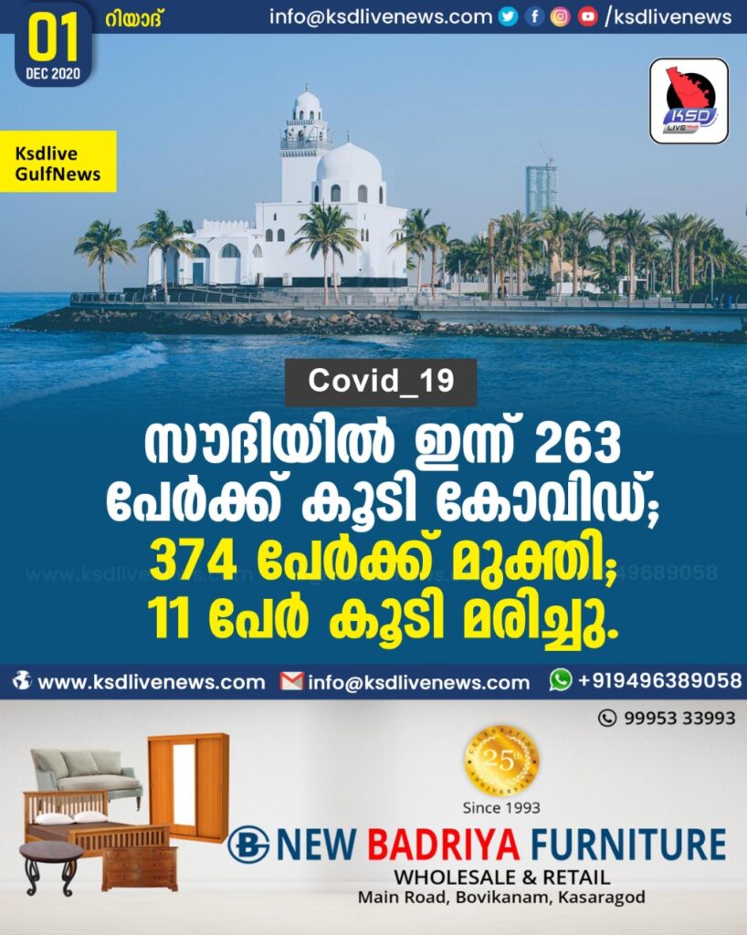 സൗദിയിൽ ഇന്ന് 263 പേർക്ക് കൂടി കോവിഡ് ; 374 പേർക്ക് മുക്തി ; 11 പേർ കൂടി മരിച്ചു.