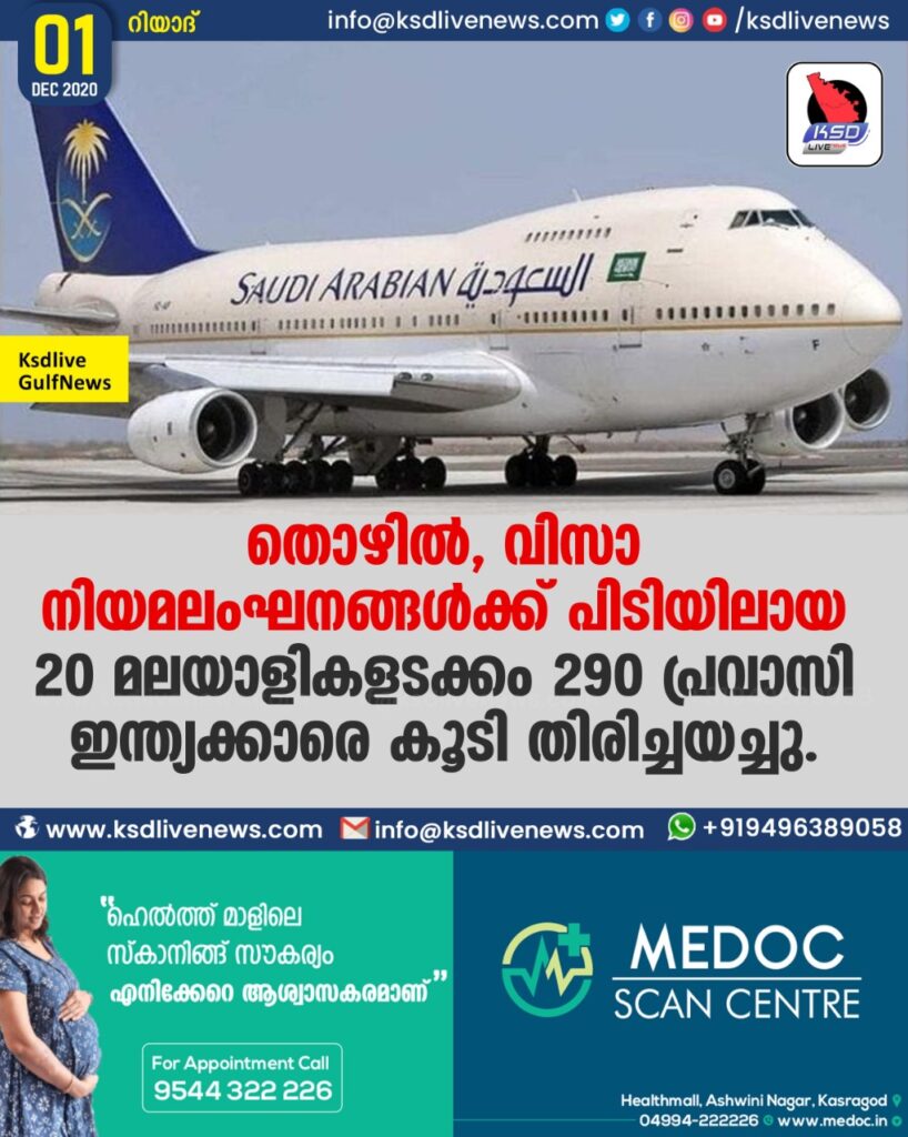 തൊഴിൽ, വിസാ നിയമലംഘനങ്ങൾക്ക് പിടിയിലായ 20 മലയാളികളടക്കം 290 പ്രവാസി ഇന്ത്യക്കാരെ കൂടി തിരിച്ചയച്ചു.