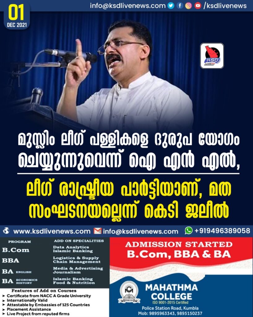 മുസ്ലിം ലീഗ് പള്ളികളെ ദുരുപയോഗം ചെയ്യുന്നുവെന്ന് ഐ എന് എല്,ലീഗ് രാഷ്ട്രീയ പാര്ട്ടിയാണ്, മത സംഘടനയല്ലെന്ന് കെ ടി ജലീൽ