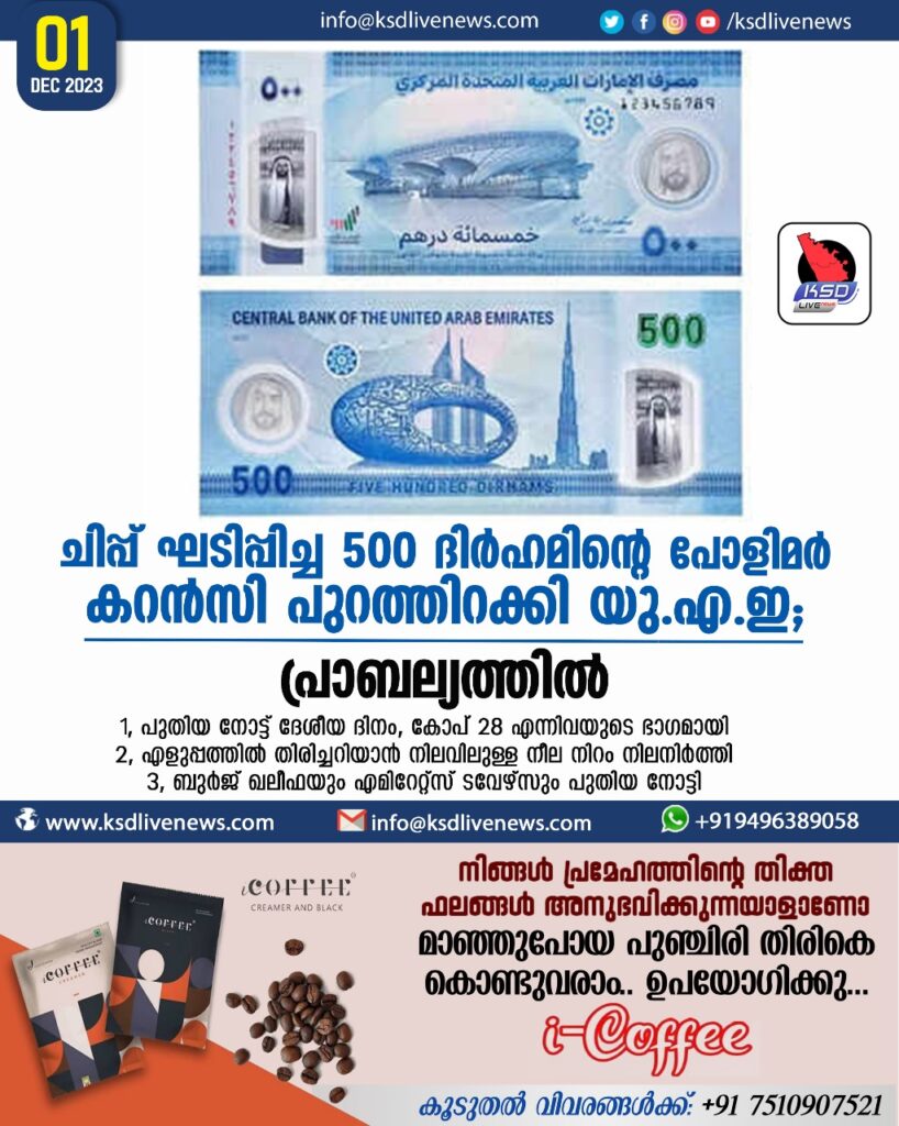 ചിപ്പ് ഘടിപ്പിച്ച 500 ദിര്ഹമിന്റെ പോളിമര് കറന്സി പുറത്തിറക്കി യുഎഇ; പ്രാബല്യത്തില്