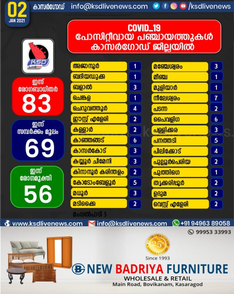 കാസർഗോഡ് ജില്ലയിൽ ഇന്ന് കോവിഡ് സ്ഥിരീകരിച്ചവരുടെ പഞ്ചായത്ത് തിരിച്ചുള്ള സ്ഥിതി വിവര കണക്ക്