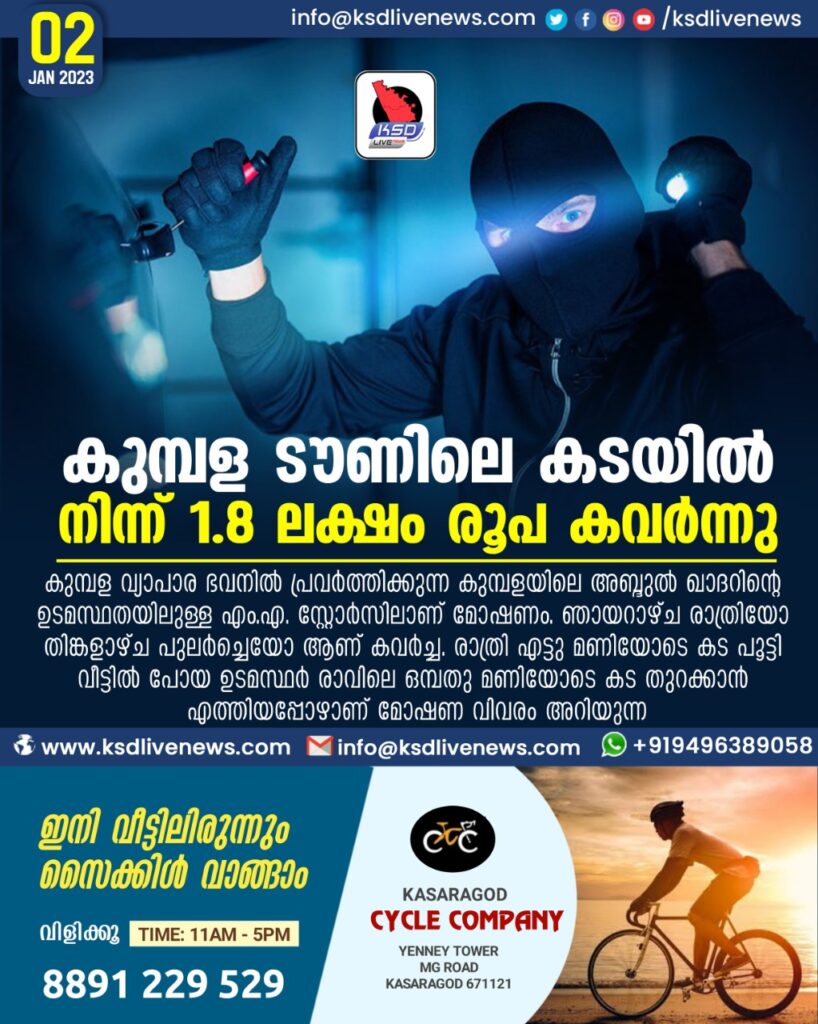 കുമ്പള ടൗണിലെ കടയിൽ നിന്ന് 1.8 ലക്ഷം രൂപ കവർന്നു