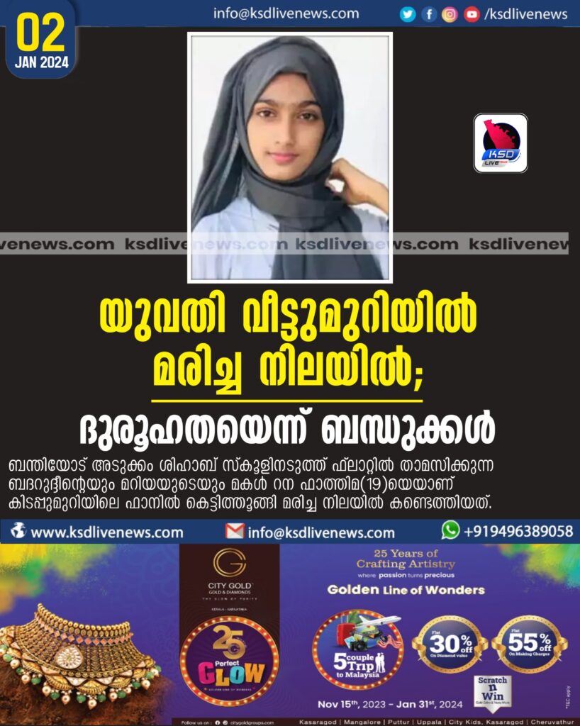 കുമ്പള: യുവതിയെ വീട്ടുമുറിയിൽ തൂങ്ങിമരിച്ച നിലയിൽ കണ്ടെത്തി. ബന്തിയോട് അടുക്കം ശിഹാബ് സ്കൂളിനടുത്ത് ഫ്ലാറ്റിൽ താമസിക്കുന്ന ബദറുദ്ദീന്റെയും മറിയയുടെയും മകൾ റന ഫാത്തിമ(19)യെയാണ് കിടപ്പുമുറിയിലെ ഫാനിൽ കെട്ടിത്തൂങ്ങി മരിച്ച നിലയിൽ കണ്ടെത്തിയത്.