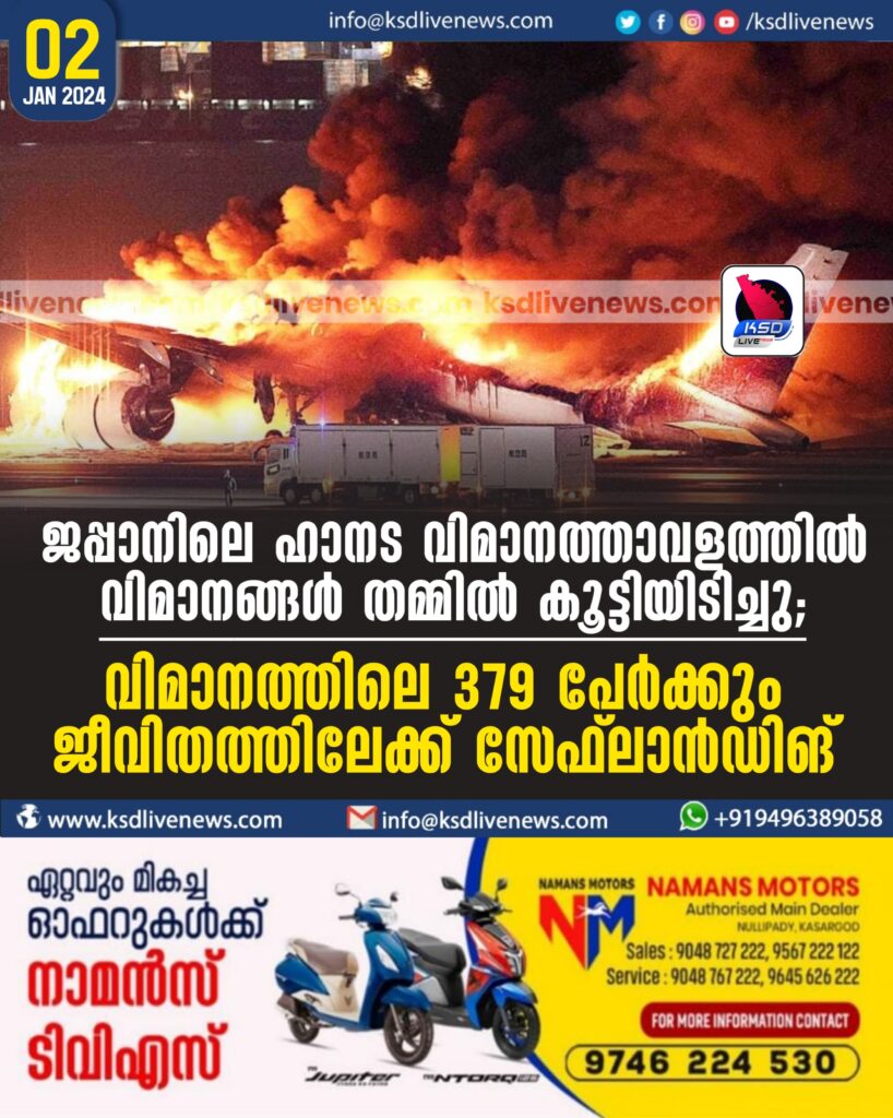 ജപ്പാനിലെ ഹാനട വിമാനത്താവളത്തിൽ വിമാനങ്ങൾ തമ്മിൽ കൂട്ടിയിടിച്ചു; വിമാനത്തിലെ 379 പേര്ക്കും ജീവിതത്തിലേക്ക് സേഫ്ലാന്ഡിങ്