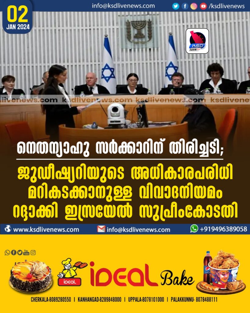 നെതന്യാഹു സര്ക്കാറിന് തിരിച്ചടി; ജുഡീഷ്യറിയുടെ അധികാരപരിധി മറികടക്കാനുള്ള വിവാദനിയമം റദ്ദാക്കി ഇസ്രയേല് സുപ്രീംകോടതി