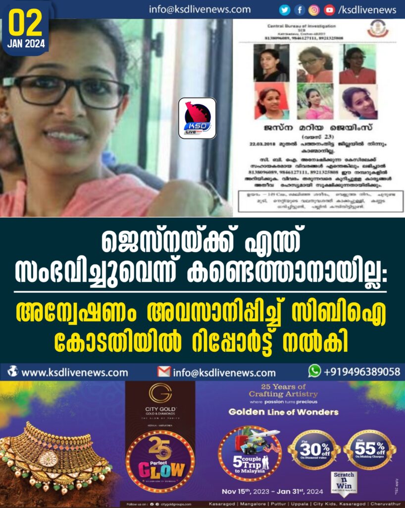ജെസ്നയ്ക്ക് എന്ത് സംഭവിച്ചുവെന്ന് കണ്ടെത്താനായില്ല: അന്വേഷണം അവസാനിപ്പിച്ച്‌ സിബിഐ കോടതിയില്‍ റിപ്പോര്‍ട്ട് നല്‍കി
