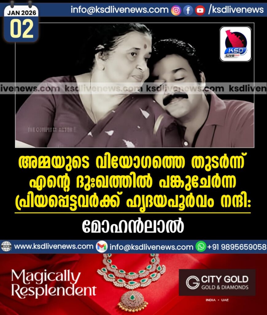 അമ്മയുടെ വിയോഗത്തെ തുടർന്ന് എന്റെ ദുഃഖത്തിൽ പങ്കുചേർന്ന പ്രിയപ്പെട്ടവർക്ക് ഹൃദയപൂർവം നന്ദി: മോഹൻലാൽ