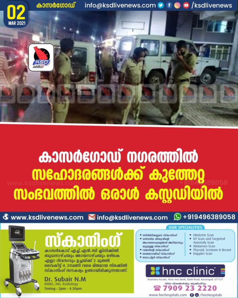 കാസർഗോഡ് നഗരത്തിൽ സഹോദരങ്ങള്‍ക്ക് കുത്തേറ്റ സംഭവത്തില്‍ ഒരാള്‍ കസ്റ്റഡിയില്‍