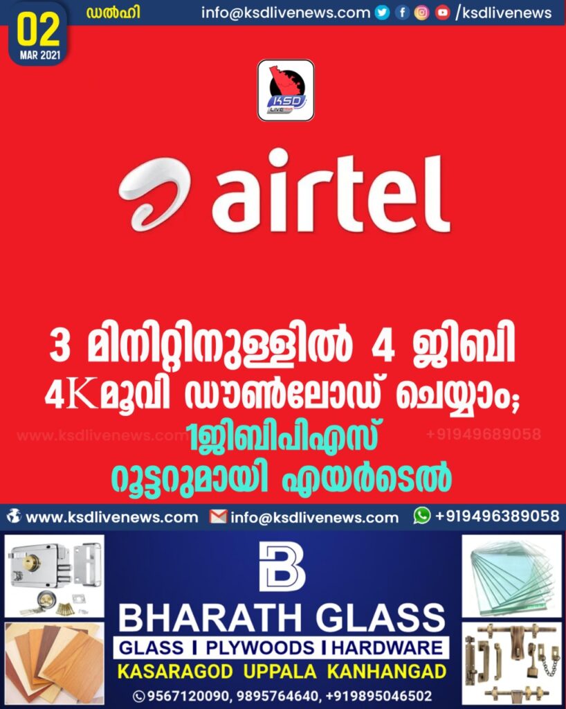 3 മിനിറ്റിനുള്ളില് 4 ജിബി 4K മൂവി ഡൗണ്ലോഡ് ചെയ്യാം; 1ജിബിപിഎസ് റൂട്ടറുമായി എയര്ടെൽ