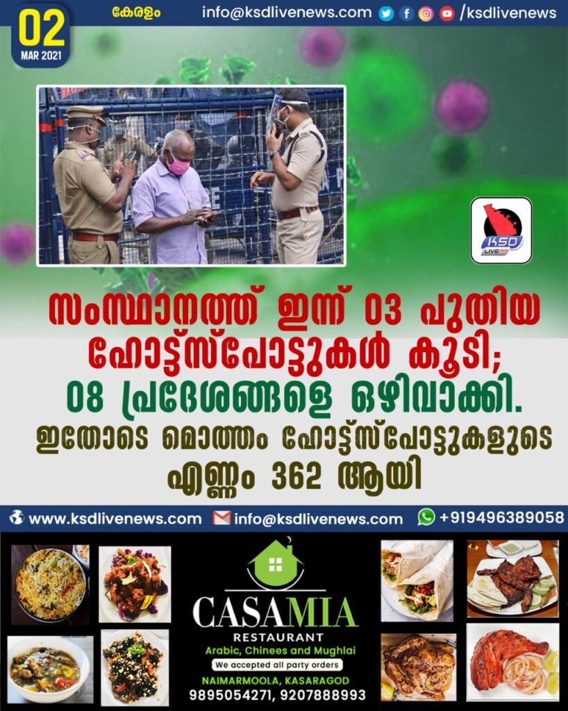 സംസ്ഥാനത്ത് ഇന്ന് 03 പുതിയ ഹോട്ട്സ്പോട്ടുകള് കൂടി; 08 പ്രദേശങ്ങളെ ഒഴിവാക്കി. ഇതോടെ മൊത്തം ഹോട്ട്സ്പോട്ടുകളുടെ എണ്ണം 362 ആയി.SHARE THIS ONഇന്ന് 3 പുതിയ ഹോട്ട് സ്പോട്ടുകള്. 8 പ്രദേശങ്ങളെ ഹോട്ട് സ്പോട്ടില് നിന്നും ഒഴിവാക്കി. നിലവില് ആകെ 362 ഹോട്ട് സ്പോട്ടുകളാണുള്ളത്.