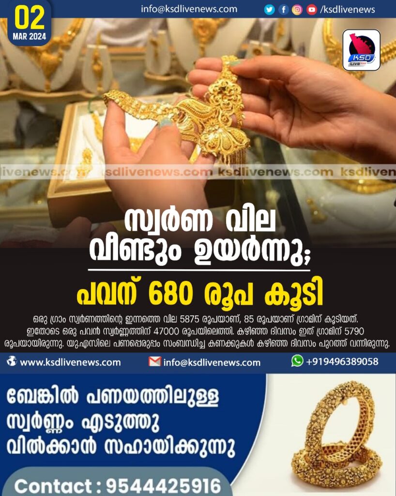 സ്വര്ണവില വീണ്ടും ഉയര്ന്നു; പവന് 680 രൂപ കൂടി
