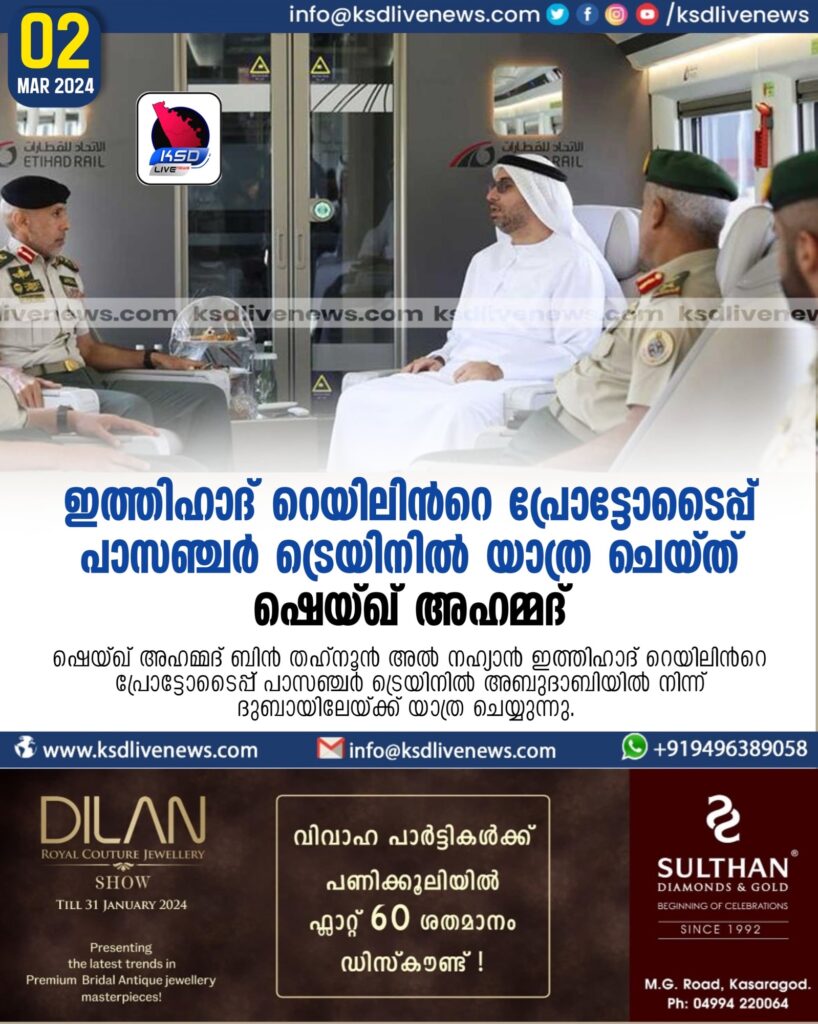 അബുദാബി: യുഎഇ സായുധ സേനയുടെ ഡപ്യൂട്ടി ചീഫ് ഓഫ് സ്റ്റാഫ് മേജർ ജനറൽ  ഷെയ്ഖ് അഹമ്മദ് ബിൻ തഹ്‌നൂൻ അൽ നഹ്യാൻ ഇത്തിഹാദ് റെയിലിന്‍റെ പ്രോട്ടോടൈപ്പ് പാസഞ്ചർ ട്രെയിനിൽ അബുദാബിയിൽ നിന്ന് ദുബായിലേയ്ക്ക് യാത്ര ചെയ്തു.  ഇത്തിഹാദ് റെയിലിന്‍റെ പ്രധാന പ്രവർത്തനങ്ങളും അറ്റകുറ്റപ്പണികളും നടത്തുന്ന അബുദാബിയിലെ അൽ ഫയയിൽ നിന്ന് ദുബായിലെ അൽ ഖുദ്രയിലേക്കായിരുന്നു യാത്ര.