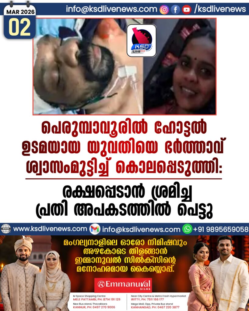 പെരുമ്പാവൂരില് ഹോട്ടല് ഉടമയായ യുവതിയെ ഭര്ത്താവ് ശ്വാസംമുട്ടിച്ച് കൊലപ്പെടുത്തി; രക്ഷപ്പെടാൻ ശ്രമിച്ച പ്രതി അപകടത്തില് പെട്ടു
