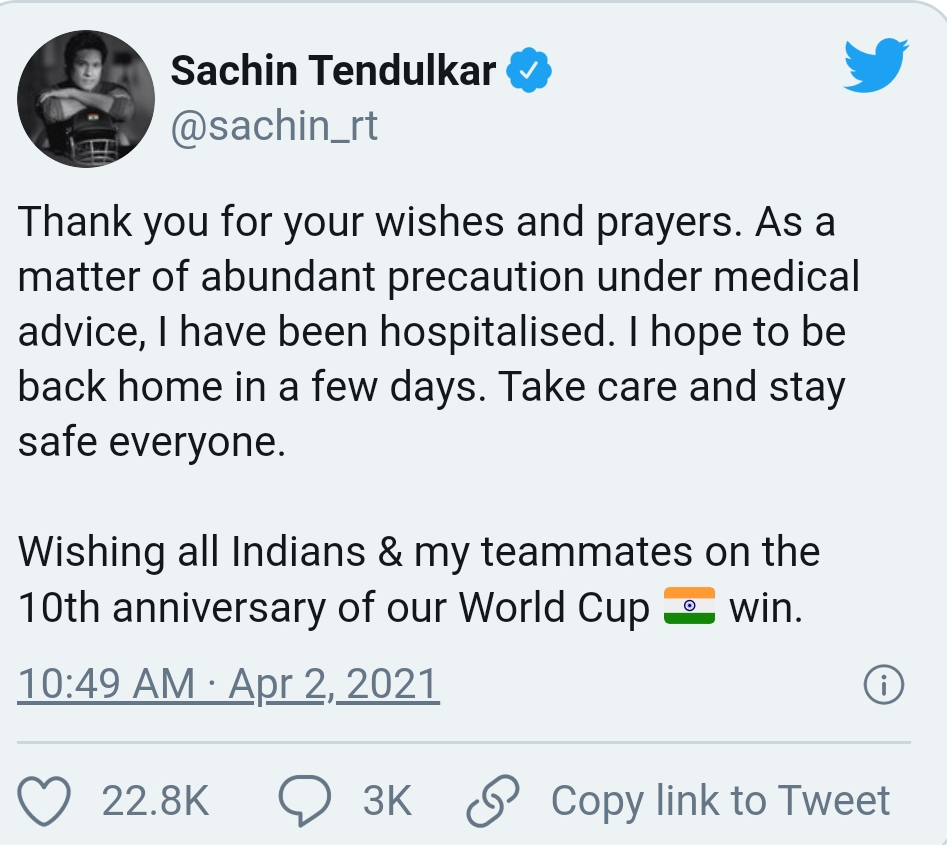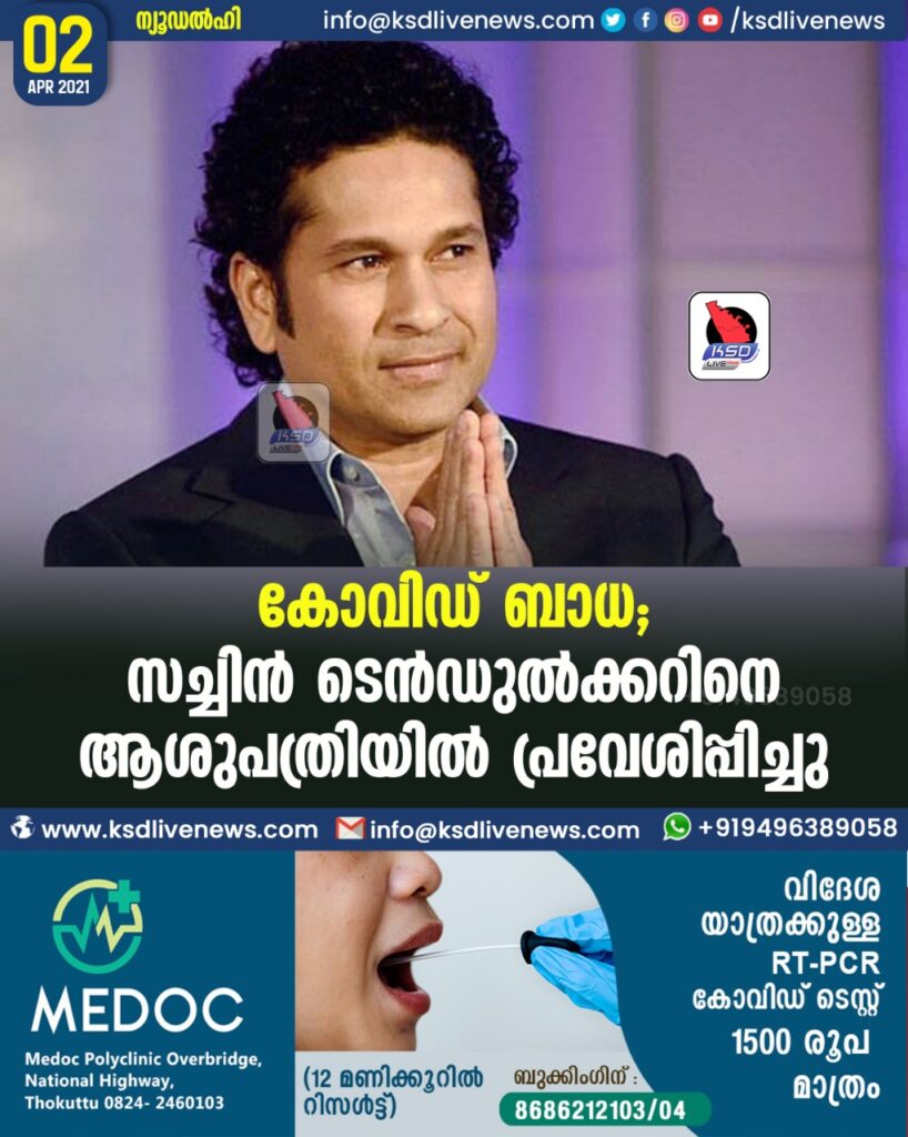 കോവിഡ് ബാധ : സച്ചിൻ ടെൻഡുൽക്കറിനെ ആശുപത്രിയിൽ പ്രവേശിപ്പിച്ചു