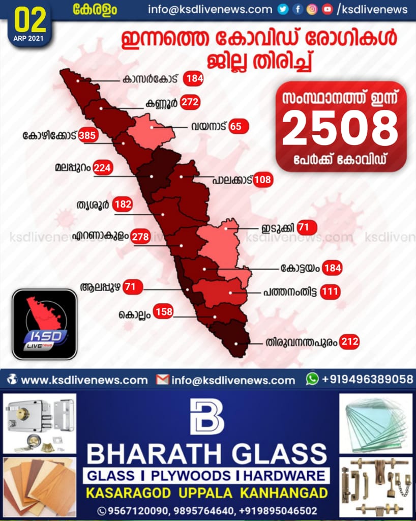 സംസ്ഥാനത്ത് ഇന്ന് 2508 പേര്ക്ക് കോവിഡ്-19 സ്ഥിരീകരിച്ചു. കോഴിക്കോട് 385, എറണാകുളം 278, കണ്ണൂർ 272, മലപ്പുറം 224, തിരുവനന്തപുരം 212, കാസർഗോഡ് 184, കോട്ടയം 184, തൃശ്ശൂർ 182, കൊല്ലം 158, പത്തനംതിട്ട 111, പാലക്കാട് 103, ആലപ്പുഴ 75, ഇടുക്കി 71,വയനാട് 69 എന്നിങ്ങനേയാണ് ജില്ലകളില് ഇന്ന് രോഗ ബാധ സ്ഥിരീകരിച്ചത്