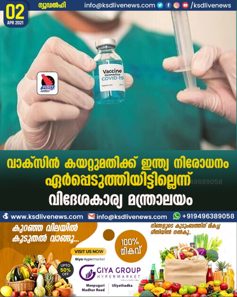 വാക്സിന് കയറ്റുമതിക്ക് ഇന്ത്യ നിരോധനം ഏര്പ്പെടുത്തിയിട്ടില്ലെന്ന് വിദേശകാര്യ മന്ത്രാലയം