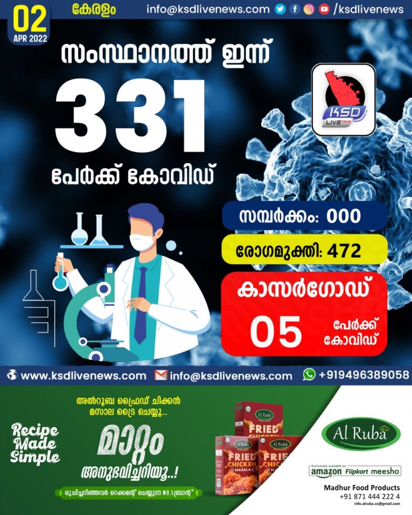 സംസ്ഥാനത്ത് ഇന്ന് 331 കോവിഡ് സ്ഥിരീകരിച്ചു. സമ്പർക്കം വഴി 000 പേർക്കും ; ആശ്വാസമായി 472 പേർക്ക് രോഗമുക്തി ; കാസർഗോഡ് ജില്ലയിൽ 05 പേർക്ക് പുതിയ കോവിഡ് കേസുകൾ ; മരണം 01