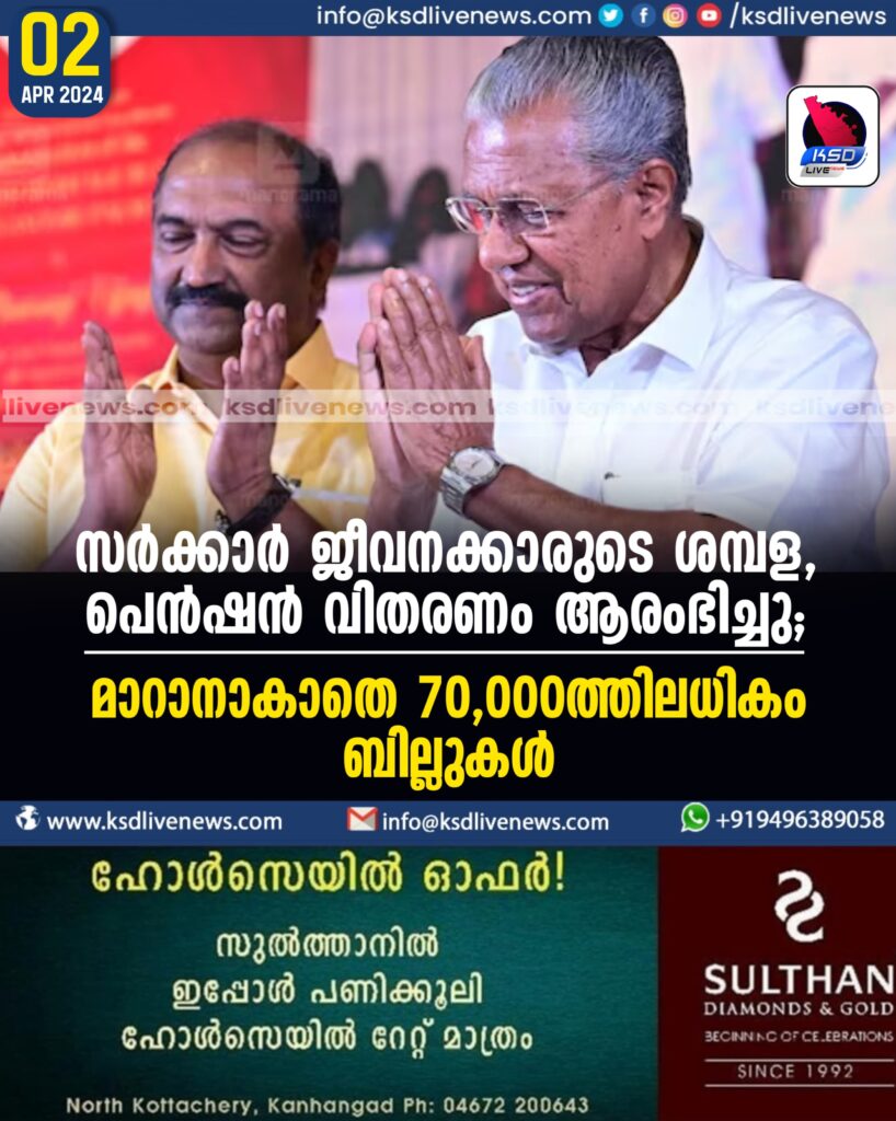 തിരുവനന്തപുരം∙ സർക്കാർ ജീവനക്കാരുടെ ശമ്പളവും വിരമിച്ച ജീവനക്കാരുടെ പെൻഷനും വിതരണം ചെയ്യുന്നത് ആരംഭിച്ചു. പെന്ഷൻകാരുടെ മൂന്നാം പെൻഷൻ പരിഷ്ക്കരണ കുടിശികയും വിതരണം തുടങ്ങി. ഇനി ഒരു ഗഡുവാണ് ശേഷിക്കുന്നത്. 70,000ലധികം ബില്ലുകൾ സംസ്ഥാനത്ത് മാറാതെ കെട്ടിക്കിടക്കുന്നുണ്ട്. കൂടുതലും തദ്ദേശ സ്ഥാപനങ്ങളുടേതാണ്. സാമ്പത്തിക വർഷത്തിന്റെ അവസാന ദിവസങ്ങളിൽ ബില്ലുകൾ ഇ സബ്മിഷൻ ചെയ്യാൻ നിയന്ത്രണം ഏർപ്പെടുത്തിയിരുന്നു. 5 ലക്ഷത്തിന് മുകളിലുള്ള ബില്ലുകൾ മാറുന്നതിനും നിയന്ത്രണം ഉണ്ടായിരുന്നു. തിരഞ്ഞെടുപ്പ് ചെലവുകൾക്കുള്ള ബില്ലുകൾ മാറിനല്കുന്നില്ലെന്ന് ചില ജില്ലകളിൽനിന്ന് പരാതി ഉയർന്നു. എന്തെങ്കിലും തടസമുണ്ടെങ്കിൽ ഉടൻ പരിഹരിക്കുമെന്ന് അധികൃതർ പറഞ്ഞു. പുതിയ സാമ്പത്തിക വർഷം ആരംഭിച്ചതോടെ ബില്ലുകൾ തടസമില്ലാതെ മാറി നല്കാൻ സർക്കാരിനു കഴിയും. 40,000 കോടി രൂപ ഈ വർഷം കടമെടുക്കാനാകുമെന്നാണ് സംസ്ഥാനം പ്രതീക്ഷിക്കുന്നത്. കേന്ദ്ര അനുമതി ലഭിക്കുന്നതുവരെ റിസർവ് ബാങ്കിൽനിന്ന് കടമെടുക്കാനാകും. സാമ്പത്തിക വർഷത്തിന്റെ ആരംഭത്തിലാണ് കേന്ദ്രത്തിൽനിന്നുള്ള നികുതി വിഹിതവും ലഭിക്കുന്നത്. ഇക്കാരണങ്ങളാല് നിലവിൽ സർക്കാരിനു മുന്നിൽ വലിയ പ്രതിസന്ധികളില്ല. പദ്ധതികൾക്കായി പണം ചെലവഴിക്കുന്നത് കഴിഞ്ഞ സാമ്പത്തിക വർഷം കുറവായിരുന്നു. തദ്ദേശ വകുപ്പിന്റെ നിലവിലെ കണക്കനുസരിച്ച് 1003 കോടിരൂപയുടെ ബില്ലുകൾ മാറാനുണ്ട്. പാസാകാനുള്ള ബില്ലുകൾ 55408. മെയിന്റനൻസ് ഗ്രാൻഡ് ഉൾപ്പെടെ 73113 ബില്ലുകൾ മാറാനുണ്ട്. മെയിന്റനൻസ് ഗ്രാൻഡ് ഉൾപ്പെടെ ആകെ ട്രഷറിയിൽനിന്ന് ലഭിക്കാനുള്ളത് 1648 കോടിരൂപ. തദ്ദേശവകുപ്പിന്റെ തുക ചെലവഴിക്കൽ 67.45%. ഇതുവരെ ചെലവഴിച്ചത് 5032കോടി. കൂടുതല് ബില്ലുകൾ മാറാനുള്ള ഗ്രാമപഞ്ചായത്തുകളുടെ പദ്ധതി നിർവഹണം സാമ്പത്തിക വർഷത്തിന്റെ 69.88ശതമാനമായിരുന്നു. കഴിഞ്ഞ സാമ്പത്തിക വർഷം പദ്ധതി നിർവഹണം 85.28 ശതമാനമായിരുന്നു. ഇന്ന് ശമ്പളം ലഭിക്കുന്ന വകുപ്പുകൾ: ലാൻഡ് റവന്യൂ, എക്സൈസ്, വെഹിക്കൾ ടാക്സ്, സെയിൽ ടാക്സ്, മറ്റ് നികുതി വിഭാഗങ്ങൾ, ചീഫ് ഇലക്ട്രൽ ഇൻസ്പക്ട്രേറ്റ്, സ്റ്റാംപ്സ്, റജിസ്ട്രേഷൻ, നിയമസഭ, ഇലക്ഷൻ, പൊതുഭരണവകുപ്പിനു കീഴിൽവരുന്ന സ്ഥാപനങ്ങൾ, നീതിന്യായവകുപ്പ്, ജയിൽ, പൊലീസും ഫയർഫോഴ്സും, സ്റ്റേഷനറി ആൻഡ് പ്രിന്റിങ്, ഇൻഷുറൻസ്, ചെക്കുകൾ നൽകുന്ന എല്ലാ വകുപ്പുകളും, ഹരിജൻ വെൽഫെയർ, മുനിസിപ്പാലിറ്റീസ്, ജല ഗതാഗതം.