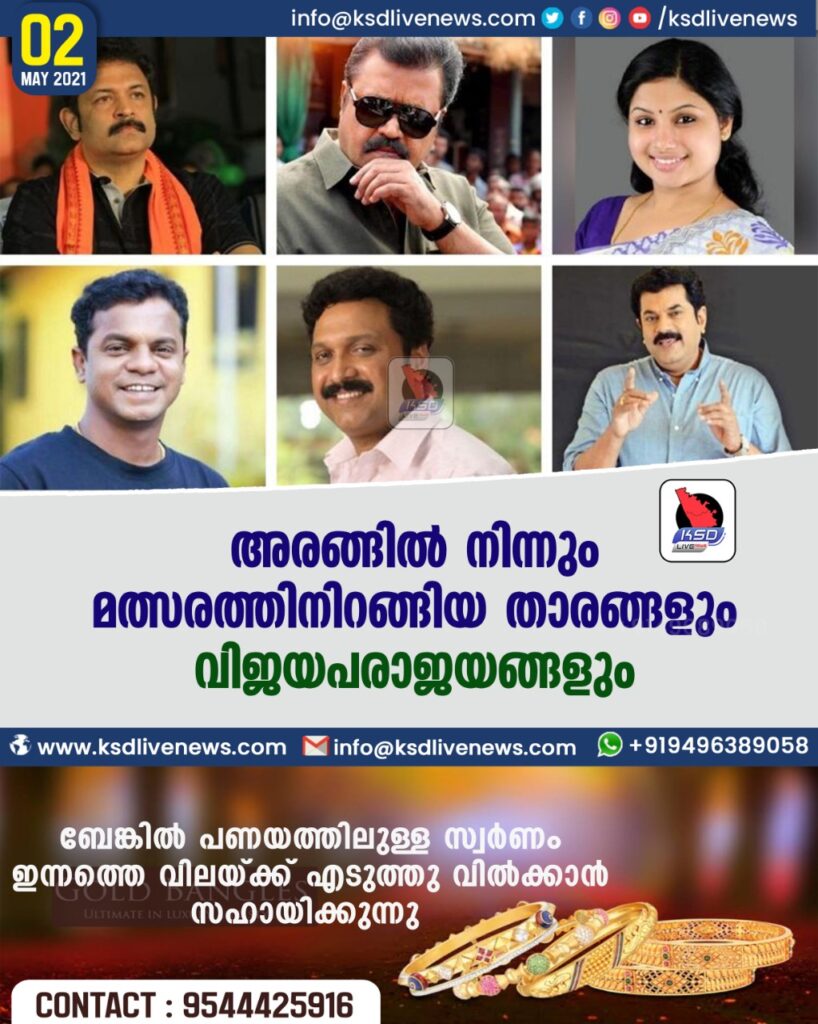 ധര്മ്മജന് ബോള്ഗാട്ടി- ചലച്ചിത്രതാരം ധര്മ്മജന് ബോള്ഗാട്ടി മത്സരിച്ചത് കോഴിക്കോട് ജില്ലയിലെ ബാലുശേരി നിയോജക മണ്ഡലത്തിലാണ്. യുഡിഎഫ് സ്ഥാനാര്ത്ഥിയായി മത്സരിച്ച താരം പരാജയപ്പെട്ടു. എല്ഡിഎഫ് സ്ഥാനാര്ത്ഥി കെ.എം. സച്ചിന്ദേവാണ് ബാലുശേരിയില് വിജയിച്ചത്. വോട്ടെണ്ണലിന്റെ ആരംഭത്തില് ധര്മജന് ലീഡ് നിലയില് മുന്നിലെത്തിയിരുന്നുവെങ്കിലും ആദ്യ രണ്ട് ഘട്ടങ്ങള് കഴിഞ്ഞപ്പോള് മുതല്ക്കേ എല്ഡിഎഫിന് ശക്തമായ മുന്നേറ്റം പ്രകടമായിരുന്നു. ലിബിന് ഭാസ്കര് ആണ് മണ്ഡലത്തില് മത്സരിച്ച എന്ഡിഎ സ്ഥാനാര്ത്ഥി.