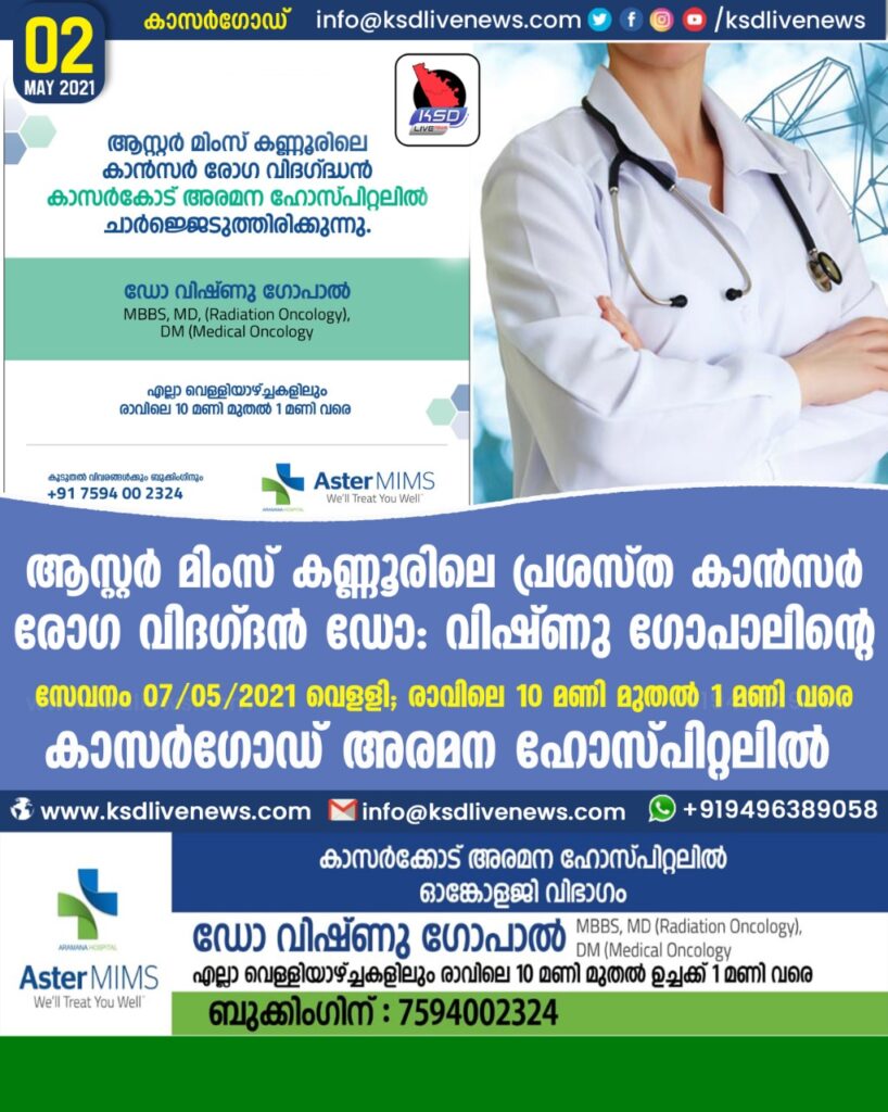 ആസ്റ്റർ മിംസ് കണ്ണൂരിലെ പ്രശസ്ത കാൻസർ രോഗ വിദഗ്ദൻ ഡോ : വിഷ്ണു ഗോപാലിന്റെ സേവനം 07/05/2021 വെളളി , രാവിലെ 10 മണി മുതൽ 1 മണി വരെ കാസർഗോഡ് അരമന ഹോസ്പിറ്റലിൽ