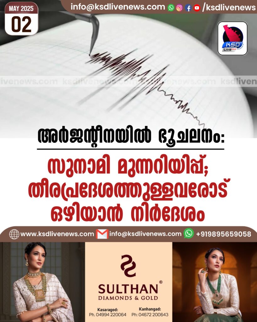 അര്ജന്റീനയില് ഭൂചലനം, സുനാമി മുന്നറിയിപ്പ്; തീരപ്രദേശത്തുള്ളവരോട് ഒഴിയാൻ നിര്ദേശം