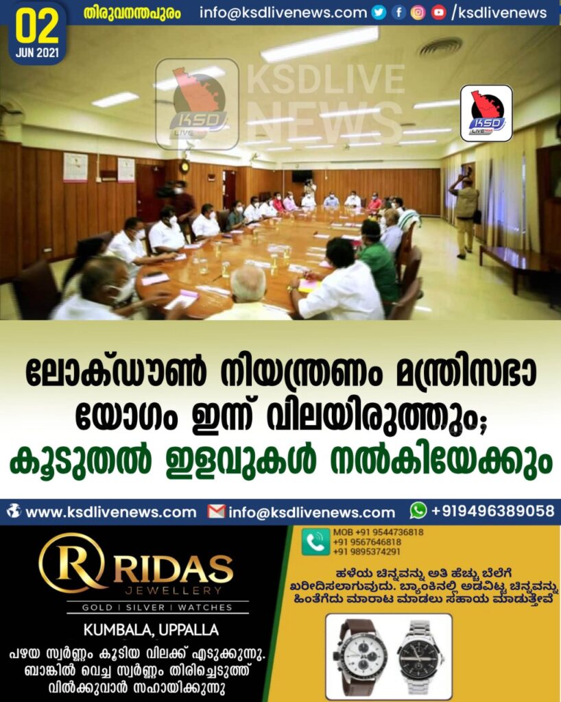 ലോക്ഡൗണ്‍ നിയന്ത്രണം മന്ത്രിസഭാ യോഗം ഇന്ന് വിലയിരുത്തും; കൂടുതല്‍ ഇളവുകള്‍ നല്‍കിയേക്കും