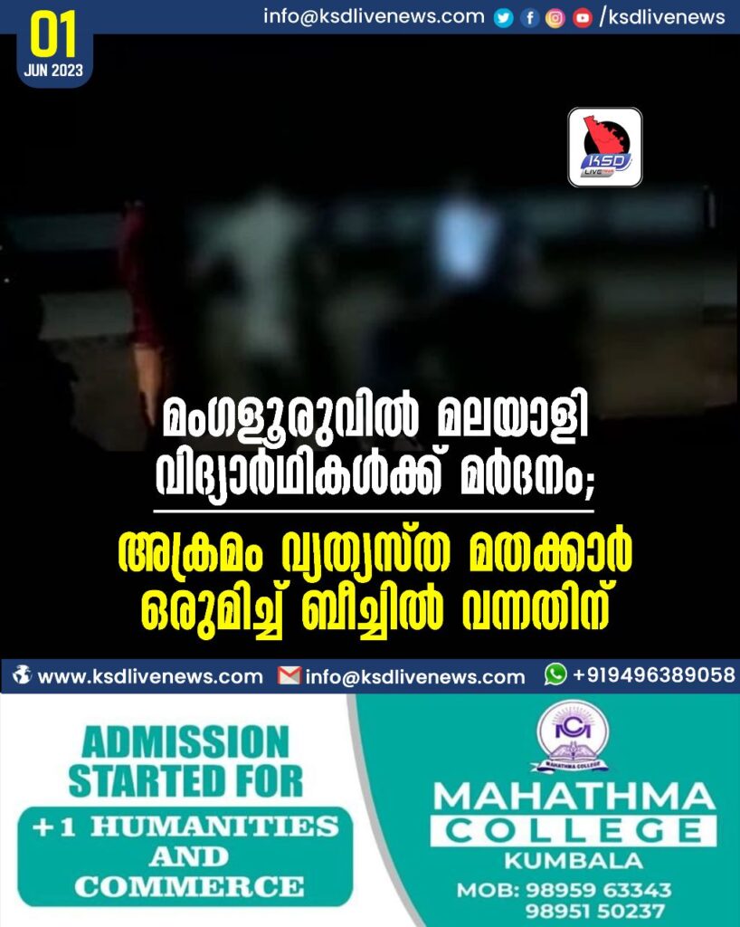 മംഗളൂരുവിൽ മലയാളി വിദ്യാർഥികൾക്ക് മർദനം; അക്രമം വ്യത്യസ്ത മതക്കാര് ഒരുമിച്ച് ബീച്ചിൽ വന്നതിന്