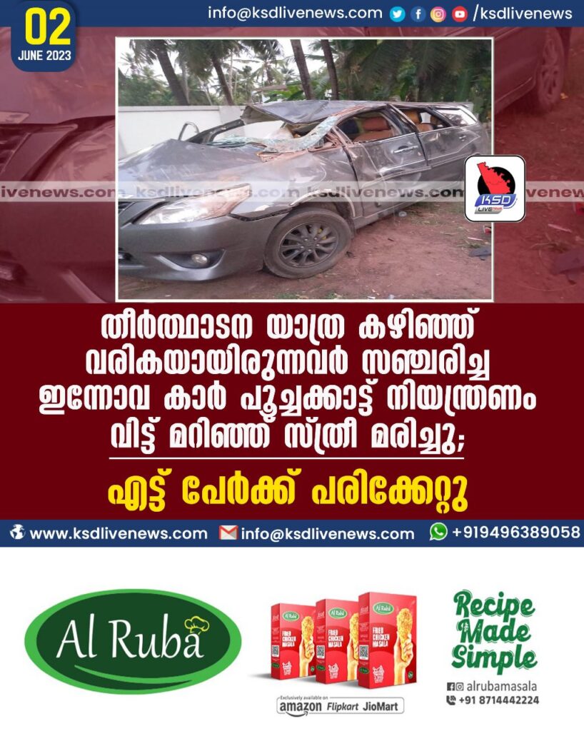 തീർത്ഥാടന യാത്ര കഴിഞ്ഞ് വരികയായിരുന്നവർ സഞ്ചരിച്ച ഇന്നോവ കാർ പൂച്ചക്കാട്ട് നിയന്ത്രണം വിട്ട് മറിഞ്ഞ് സ്ത്രീ മരിച്ചു; എട്ട് പേർക്ക് പരിക്കേറ്റു