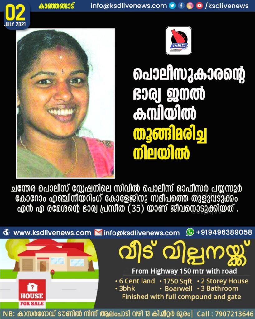 കാഞ്ഞങ്ങാട് : പോലീസുകാരന്റെ ഭാര്യയെ കിടപ്പുമുറിയിൽ തൂങ്ങിമരിച്ച നിലയിൽ കണ്ടെത്തി . ചന്തേര പൊലീസ് സ്റ്റേഷനിലെ സിവിൽ പൊലീസ് ഓഫീസർ പയ്യന്നൂർ കോറോം എഞ്ചിനീയറിംഗ് കോളേജിനു സമീപത്തെ തുളുവടുക്കം എൻ എ രമേശന്റെ ഭാര്യ പ്രസീത ( 35 ) യാണ് ജീവനൊടുക്കിയത് . ഇന്നലെ രാത്രി 10 മണിയോടെയാണ് സംഭവം . മുകളിലെ കിടപ്പുമുറിയിലായിരുന്ന പ്രസീത താഴെ ഇറങ്ങിയ ശേഷം ഏറെ നേരം കഴിഞ്ഞിട്ടും തിരികെ വരാത്തതിനെ തുടർന്ന് ഭർത്താവ് താഴെ ഇറങ്ങി നോക്കിയപ്പോഴാണ് തൂങ്ങിയ നിലയിൽ കണ്ടതെന്നു പറയുന്നു . ജനൽ കമ്പിയിൽ തൂങ്ങിയ നിലയിലായിരുന്നു . ഉടൻ ആശുപത്രിയിൽ എത്തിച്ചുവെങ്കിലും രക്ഷിക്കാനായില്ല . പയ്യന്നൂർ പൊലീസ് കേസെടുത്തു . മൃതദേഹം പോസ്റ്റുമോർട്ടത്തിനായി പരിയാരം മെഡിക്കൽ കോളേജ് ആശുപത്രി മോർച്ചറിയിലേയ്ക്ക് മാറ്റി . മരണകാരണം വ്യക്തമല്ല . അജാനൂർ പഞ്ചായത്ത് മുൻ അംഗം മാവുങ്കാൽ , പള്ളാട്ടെ കെ എം ഗോപാലൻ – തങ്കമണി ദമ്പതികളുടെ മകളാണ് . നീരജ് , നിരഞ്ജന മക്കൾ . പ്രദീപ് , പ്രമോദ് ( ഇരുവരും ഗൾഫ് ) സഹോദരങ്ങളാണ് . പോസ്റ്റുമോർട്ടത്തിനു ശേഷം മൃതദേഹം പള്ളാട്ടെ വീട്ടുവളപ്പിൽ സംസ്കരിക്കും