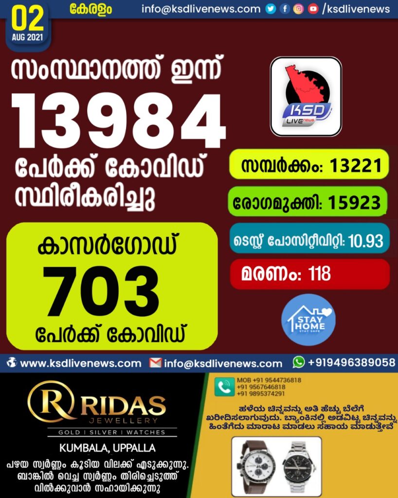 സംസ്ഥാനത്ത് ഇന്ന് 13984 പേർക്ക് കോവിഡ് സ്ഥിരീകരിച്ചു. സമ്പർക്കം വഴി 13221 പേർക്കും ; ആശ്വാസമായി 15923 പേർക്ക് രോഗ മുക്തിയും ; കാസർഗോഡ് ജില്ലയിൽ 703 പേർക്ക് പുതിയ കോവിഡ് കേസുകൾ ; മരണം 118