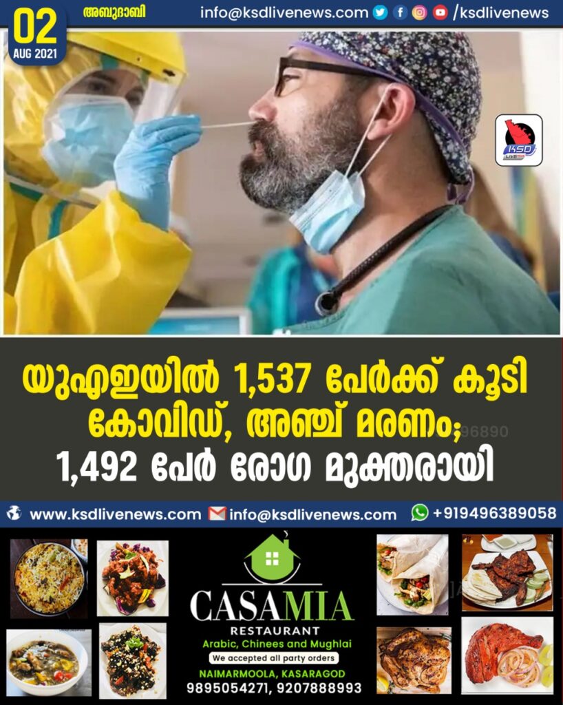 യുഎഇയില് 1,537 പേര്ക്ക് കൂടി കോവിഡ്, അഞ്ച് മരണം ; 1,492 പേർ രോഗ മുക്തരായി