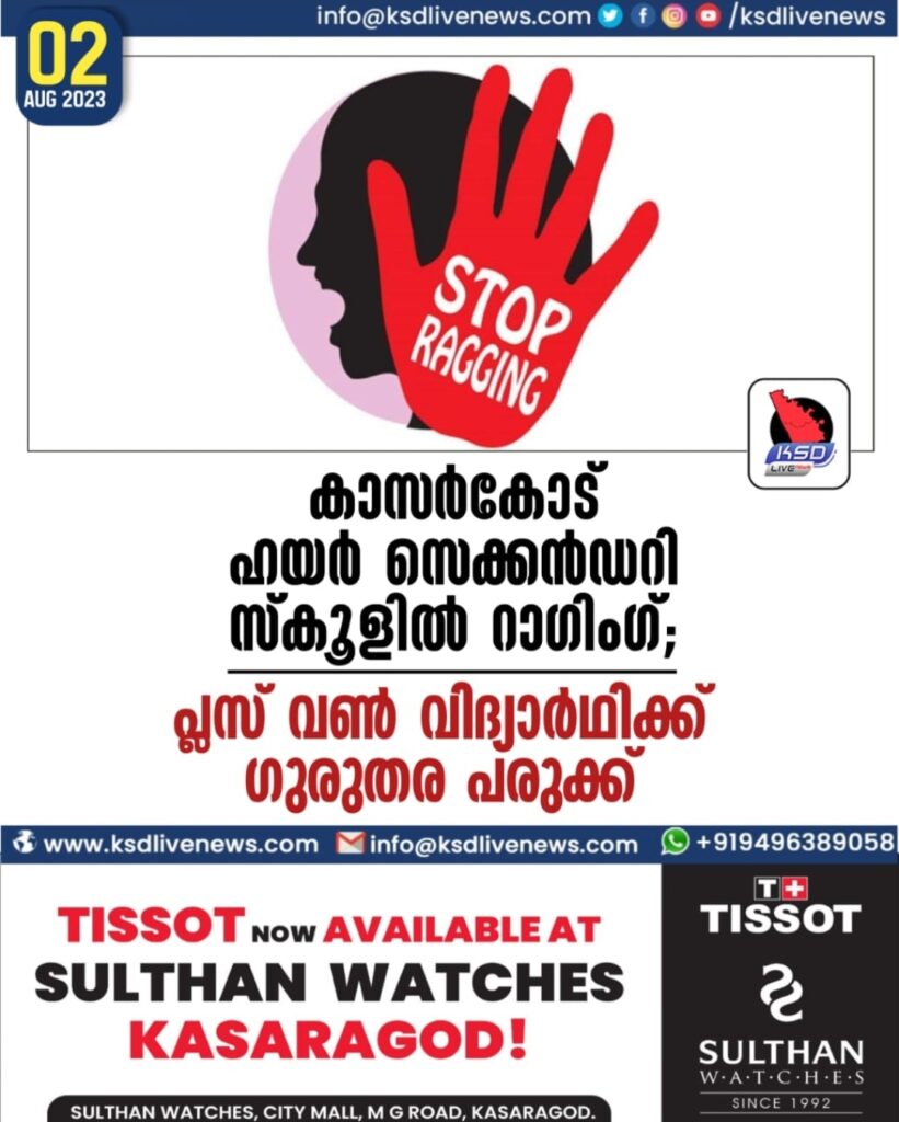 കാസർകോട് ഹയർ സെക്കൻഡറി സ്കൂളിൽ റാഗിംഗ്; പ്ലസ് വൺ വിദ്യാർഥിക്ക് ഗുരുതര പരുക്ക്