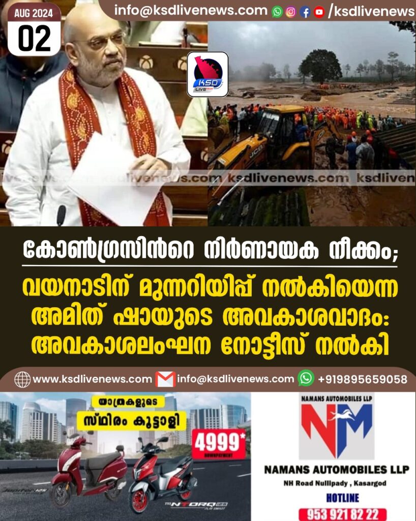 കോണ്ഗ്രസിന്റെ നിര്ണായക നീക്കം; വയനാടിന് മുന്നറിയിപ്പ് നല്കിയെന്ന അമിത് ഷായുടെ അവകാശവാദം, അവകാശലംഘന നോട്ടീസ് നല്കി