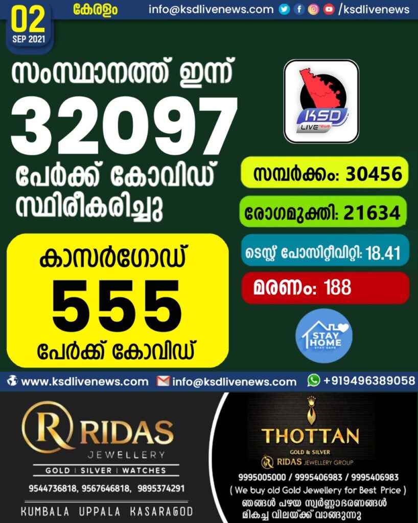 കുതിച്ചുയർന്ന് കോവിഡ് ; സംസ്ഥാനത്ത് ഇന്ന് 32,097 പേർക്ക് കോവിഡ് സ്ഥിരീകരിച്ചു. സമ്പർക്കം വഴി 30,456 പേർക്കും ; ആശ്വാസമായി 21,634 പേർക്ക് രോഗ മുക്തിയും ; കാസർഗോഡ് ജില്ലയിൽ 555 പേർക്ക് പുതിയ കോവിഡ് കേസുകൾ ; മരണം 188