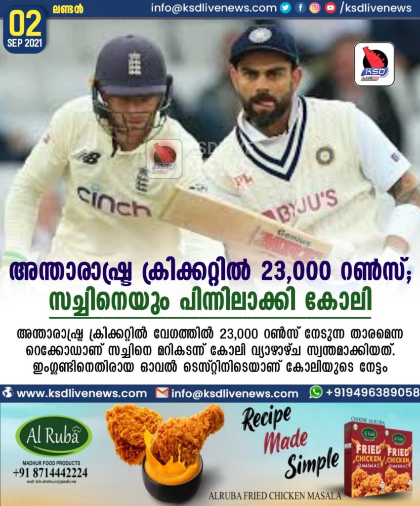 അന്താരാഷ്ട്ര ക്രിക്കറ്റിൽ വേഗത്തിൽ 23,000 റൺസ് നേടുന്ന താരമെന്ന റെക്കോഡാണ് സച്ചിനെ മറികടന്ന് കോലി വ്യാഴാഴ്ച സ്വന്തമാക്കിയത്. ഇംഗ്ലണ്ടിനെതിരായ ഓവൽ ടെസ്റ്റിനിടെയാണ് കോലിയുടെ നേട്ടം.