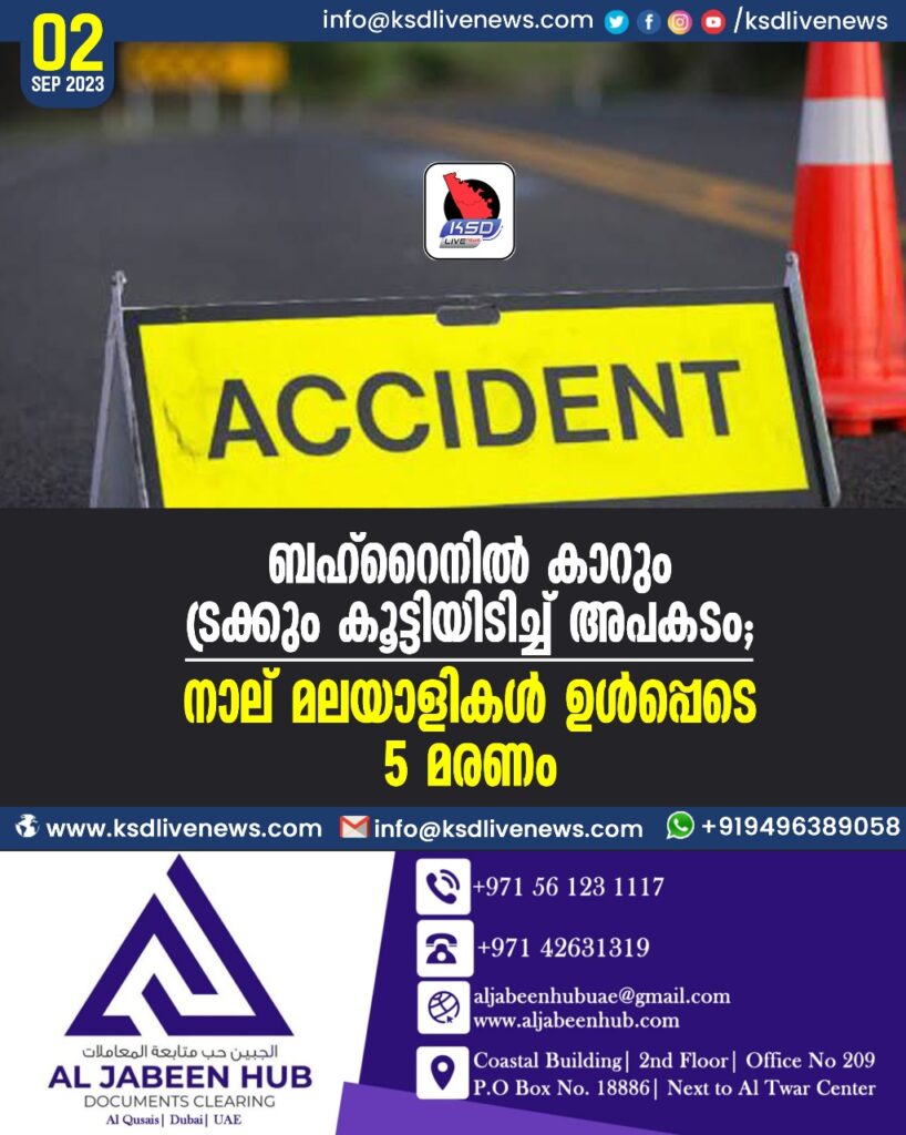 ബഹ്റൈനിൽ കാറും ട്രക്കും കൂട്ടിയിടിച്ച് അപകടം; നാല് മലയാളികൾ ഉൾപ്പെടെ 5 മരണം