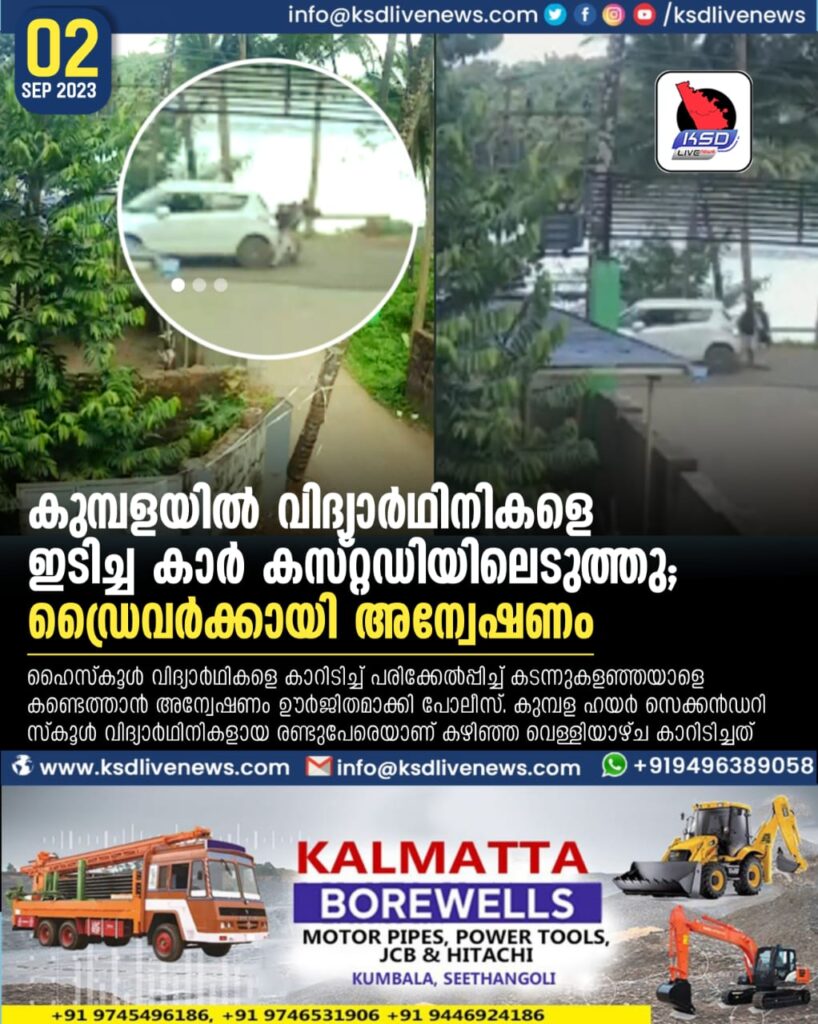കുമ്പളയിൽ വിദ്യാർഥിനികളെ ഇടിച്ച കാർ കസ്റ്റഡിയിലെടുത്തു; ഡ്രൈവർക്കായി അന്വേഷണം